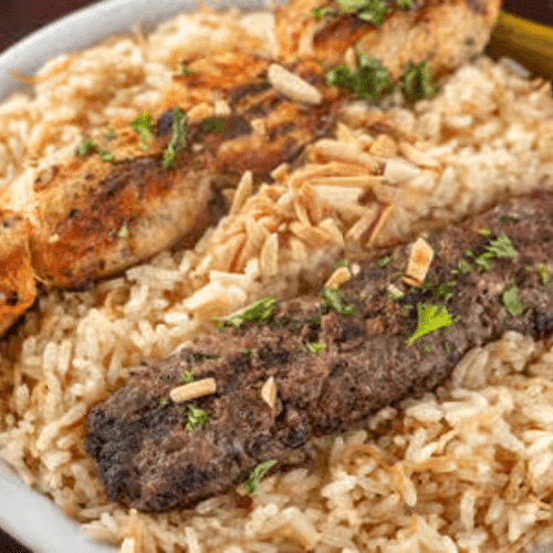One chicken kabob & one beef kafta served over a bed of rice, topped with toasted almonds & served with a choice of soup, hummus or Lebanese salad