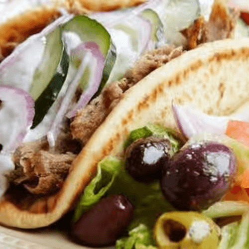 Lamb gyro on geek pita with lettuce, onion, tomato & tzatziki sauce. Serves with a choice of baba ghanouj, hummus, soup, or fries