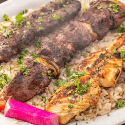 One beef kabob, one chicken kabob, one beef kafta served with choice of hummus or babaganouji and a choice of fattoush, Lebanese salad or tabbouli